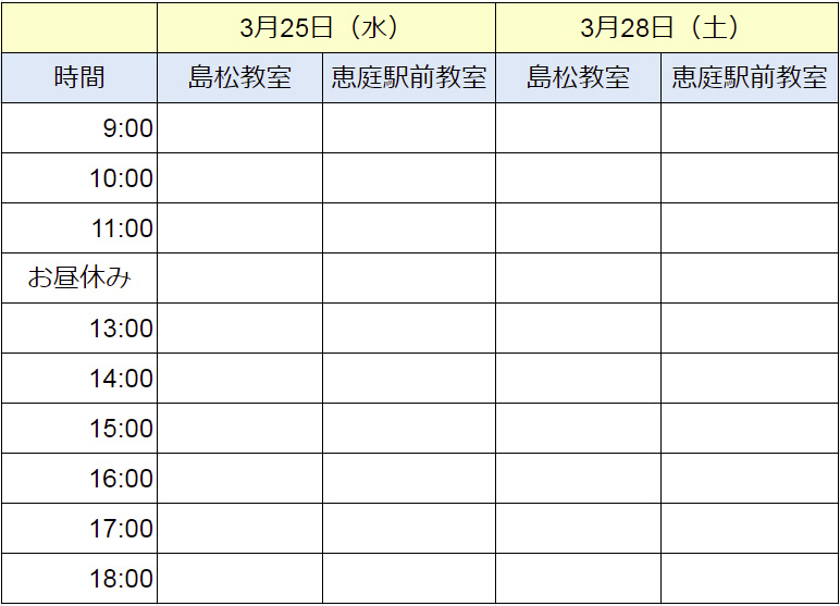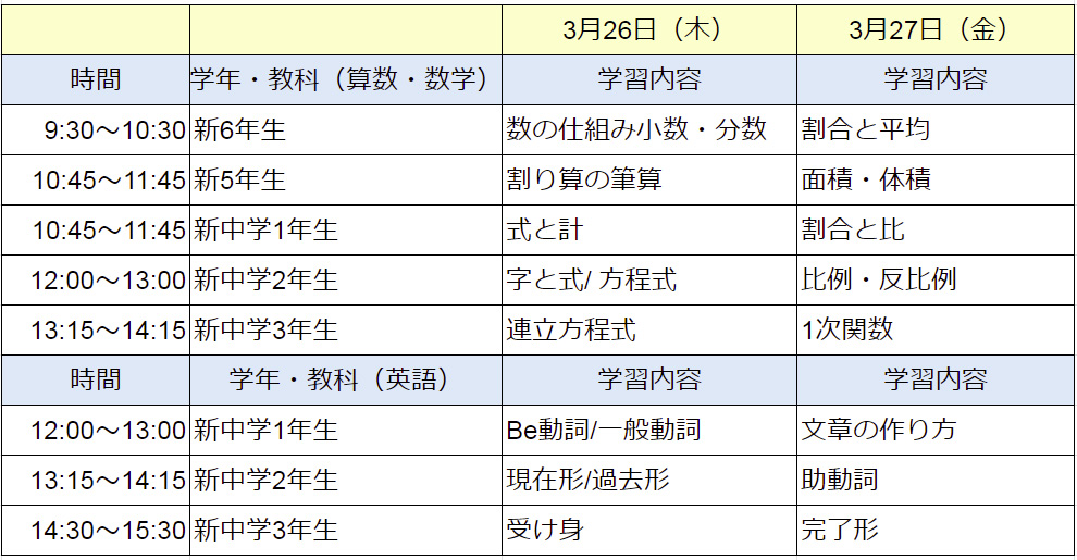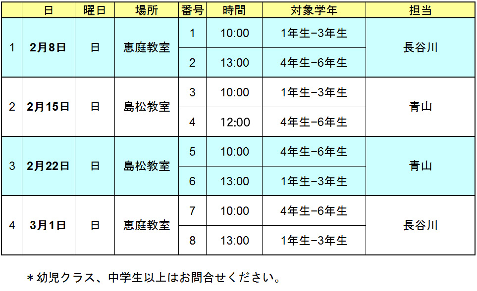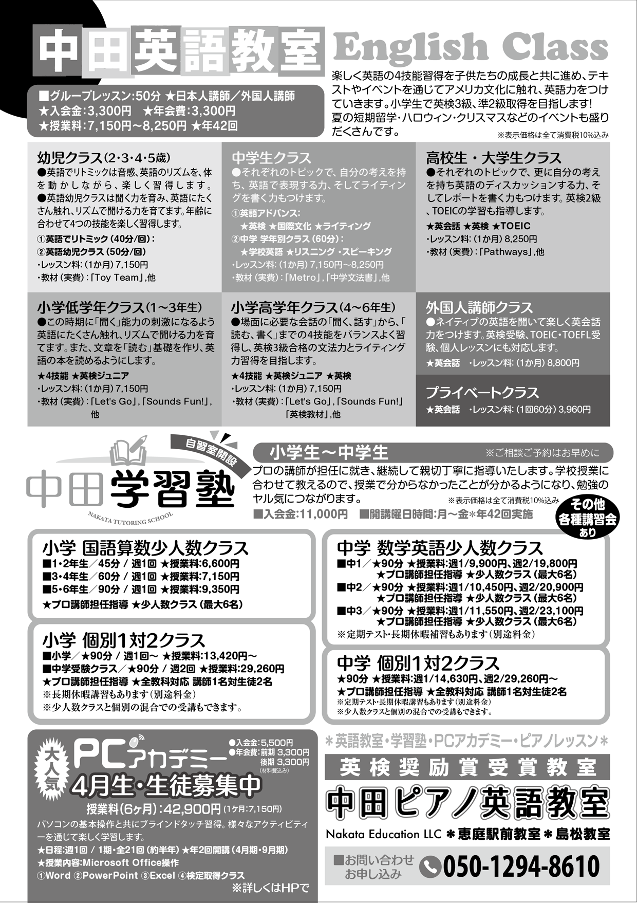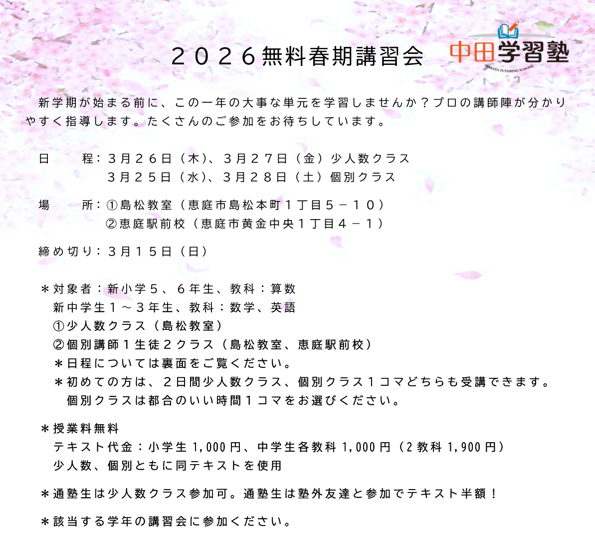 2026年度生徒募集、体験レッスンのご案内 2026年1月29日 最終更新日時 : 2026年2月4日 nakata 英語教室「無料体験レッスン」日程はこちら 中田学習塾「無料春期講習会」日程はこちら PCアカデミー常時体験受付中です! ピアノ教室常時体験受付中です! 英語クラス体験レッスン 英語体験レッスンスケジュール 英語クラス体験レッスンのお申し込みは、下の「お問い合わせ」からお願いします。 中田学習塾 春期無料講習会 少人数クラス(島松教室)講習内容/時間割 個別クラス 講習内容/時間割 中田学習塾 無料春期講習会のお申し込みは、下の「お問い合わせ」からお願いします。